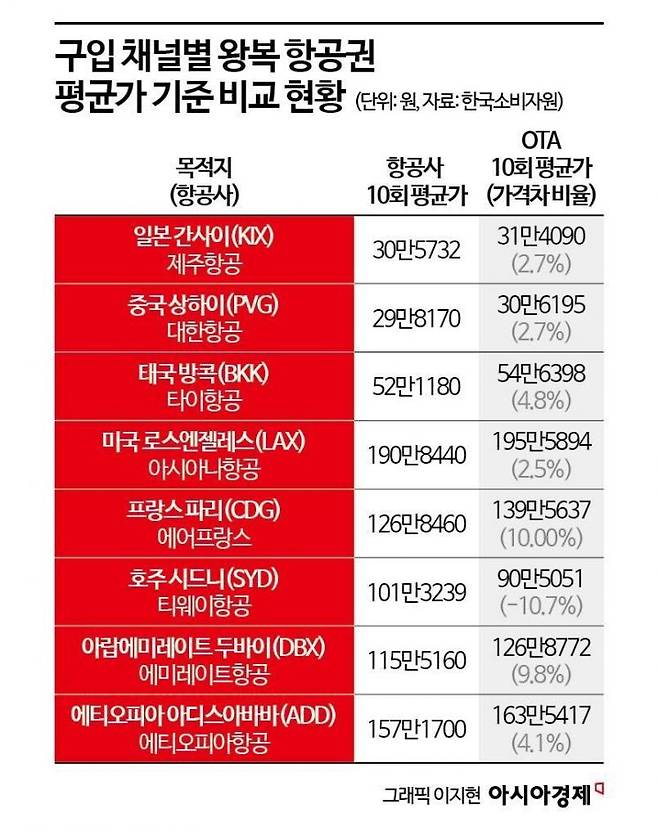 최근 1년 이내 온라인 항공권 예약 경험이 있는 소비자 600명을 대상으로 한 설문 조사에서는 항공권 가격이 가장 낮을 것으로 예상하는 구입처로 179명(29.8%)이 국내 OTA를 꼽았다. 이어 국외 OTA 27.5%(165명), 항공사 누리집 14.8%(89) 등 순이었다. 하지만 8개 노선의 왕복 항공권을 10개 OTA에서 약 1개월간 각각 10회씩 총 800회 비교 조사한 결과, OTA 판매 항공권 가격은 항공사보다 높은 경우가 무려 571회(71.4%)에 달했다. 구입처별 평균 가격을 비교해보면 5개 노선이 국외 OTA에서, 2개 노선이 국내 OTA에서, 1개 노선이 항공사에서 구입할 때 가격이 높았다.