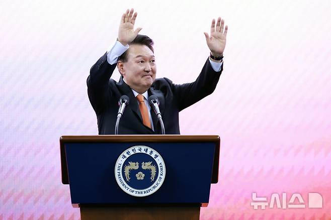 참석자들의 환호에 손인사하는 윤석열 대통령