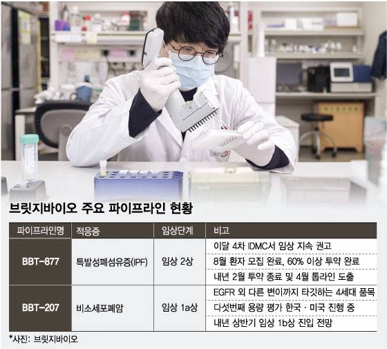 17일 브릿지바이오 관계자는 "특발성폐섬유증(IPF) 신약 후보 'BBT-877'의 글로벌 임상 2상이 마무리 절차에 돌입했다"며 "내년 2월 마지막 환자 투약을 완료하고, 4월이면 톱라인(주요결과) 도출이 가능할 것으로 보고 있다"고 말했다.