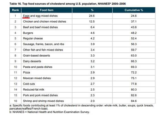 계란과 콜레스테롤과의 관계를 연구한 논문 66개를 메타 분석한 보고에 의하면, 계란 섭취는 LDL 콜레스테롤 수치를 유의하게 높이는 것으로 확인되었다 [1]. 미국암연구소에서 발표한 콜레스테롤을 증가시키는 음식에서도 당연 1위는 계란이고, 2위는 치킨, 3위는 소고기다 (아래 도표) [2].