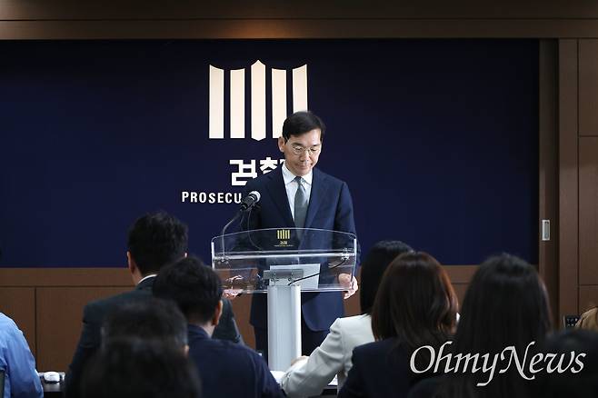 | ▲ 서울중앙지검 조상원 4차장 검사가 17일 오전 서울 서초동 서울중앙지검에서 ‘대통령 배우자의 도이치모터스 시세조종 가담 의혹 사건 수사결과’를 발표하며, 피의자인 윤석열 대통령 부인 김건희 여사에 대해 불기소 처분한다고 발표했다. |