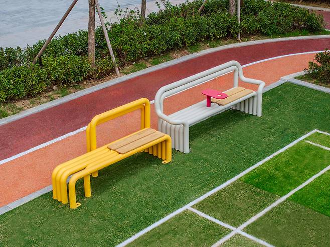 현대건설은 이 가운데 지난해 개발한 펀디자인 벤치 3종과 조명 1종으로 구성된 총 15개 유형의 펀디자인 시설물을 공동 주택에 적용합니다.
