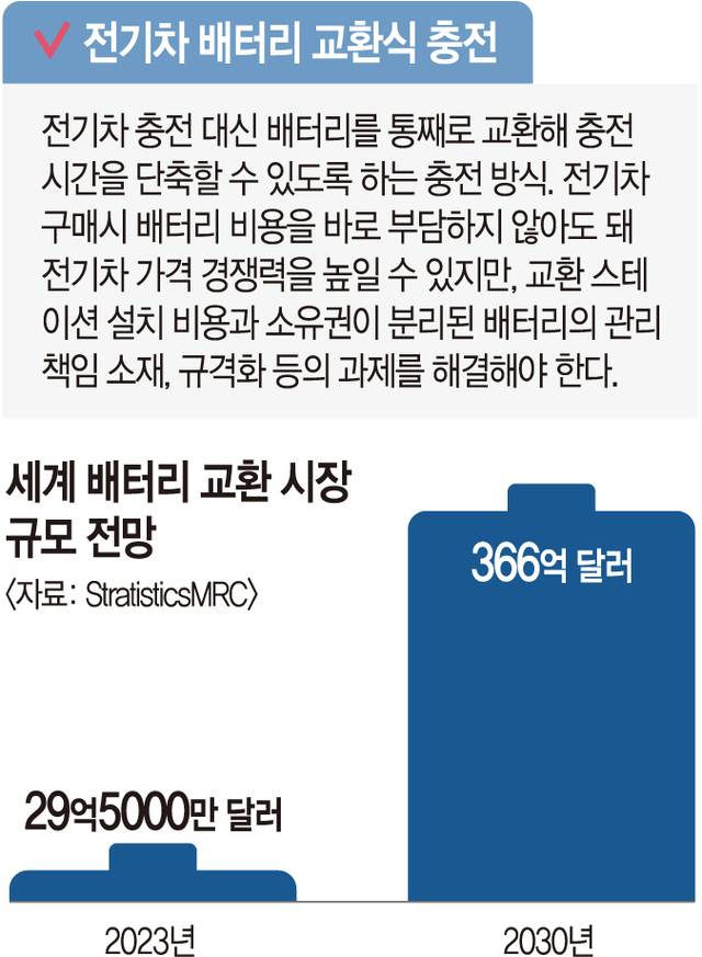 전기차를 직접 충전하지 않고 배터리를 교체해 충전하는 서비스를 국내에 도입하기 위한 첫 관문이 열렸다. 이차전지 업계는 배터리 교체 방식이 보편화할 경우 전기차 가격이 낮아지고 이용 편의성이 높아질 수 있다는 기대감을 나타낸다. 하지만 현실화까지는 해결할 과제가 많다.