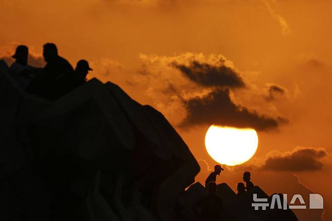 [베이루트=AP/뉴시스] 17일(현지시각) 레바논 다히예 외곽에서 이스라엘의 공습을 피해 대피한 주민들이 지중해 너머로 해가 지는 베이루트 해안가 산책로에 앉아 얘기를 나누고 있다. 2024.10.18.