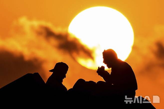 [베이루트=AP/뉴시스] 17일(현지시각) 레바논 다히예 외곽에서 이스라엘의 공습을 피해 대피한 주민들이 지중해 너머로 해가 지는 베이루트 해안가 산책로에 앉아 음식을 먹고 있다. 2024.10.18.