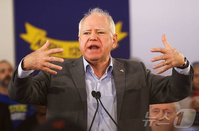 (더럼 AFP=뉴스1) 우동명 기자 = 미국 민주당 부통령 후보인 팀 월즈 미네소타 주지사가 17일 (현지시간) 노스캐롤라이나주 더럼에서 열린 선거 집회서 유세를 하고 있다. 2024.10.18