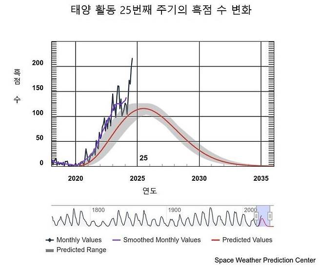 태양주기25 예측 패널의 공동의장이자 수석 과학자인 리사 업튼은 기자회견에서 “활동이 약한 주기일수록 극대기가 길어져 3~4년간 계속되는 경향이 있다”고 말했다. 과학자들은 이번 극대기는 앞으로 1년 정도 더 지속된 뒤 흑점 수 감소와 함께 극소기 국면에 들어설 것으로 예상한다.