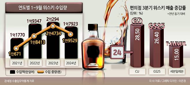 올해 위스키 수입량이 전년 동기 대비 감소한 가운데 편의점에서는 판매량이 증가한 것으로 나타났다.