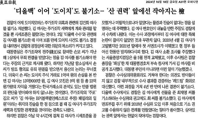 "'디올백' 이어 '도이치'도 불기소… '산 권력' 앞에선 작아지는 檢" <동아일보>