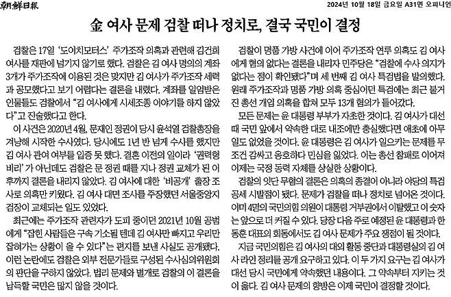 "金 여사 문제 검찰 떠나 정치로, 결국 국민이 결정"<조선일보>