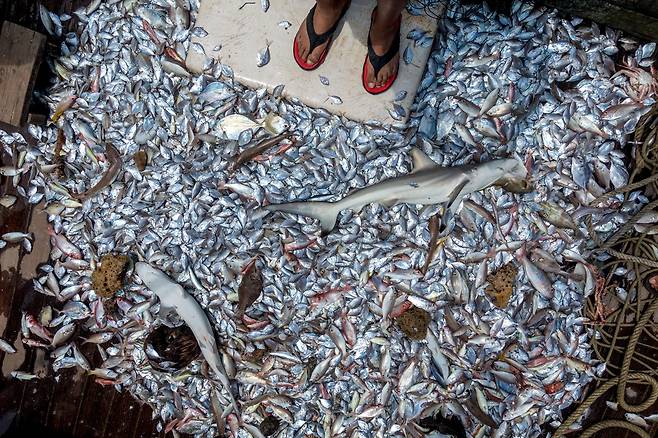 | ▲ 어업 과정에서 혼획되는 상어들 우리나라에서도 어업 과정에서 상어, 고래와 같은 해양생물이 혼획되고 있다 |