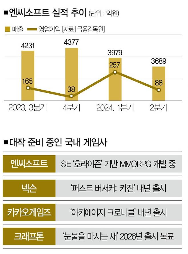 같은 기간 엔씨소프트와 함께 게임업계 3N으로 불리는 넥슨과 넷마블이 신작효과를 톡톡히 누리며 실적을 끌어올린 것과 대조적이다. 문제는 게임 대작이 엔씨소프트를 부활시키는 전략적인 무기가 될 수 있느냐다.