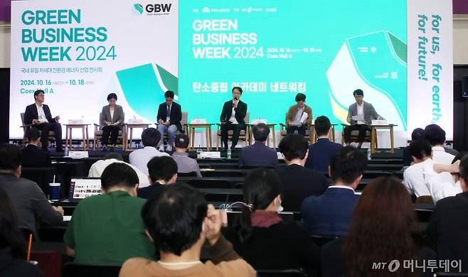 김범조 KEI컨설팅 파트너, 김현선 LG이노텍 탄소중립추진팀장/전문위원, 박영욱 SK E&S 재생에너지마케팅 1팀 팀장, 김찬수 바이와알이코리아 태양광사업본부장, 최규종 대한상공회의소 그린에너지지원센터장, 이태주 HD한국조선해양 RE전략팀장이 18일 서울 강남구 코엑스에서 열린 '그린비즈니스위크 2024' 컨퍼런스에서 패널토론을 하고 있다.