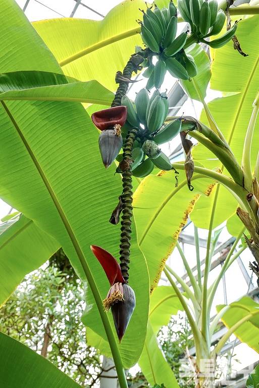 독특한 모양의 바나나 꽃은 열매와 함께 볼 수 있습니다.
