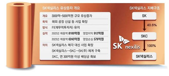 전기차 배터리용 동박 제조업체 SK넥실리스가 수천억 원 규모의 유상증자에 나선다. SK그룹 중간지주사인 SKC의 주요 자회사로 한때 매각설이 돌기도 했지만 재무건전성을 회복해 SK그룹 내 핵심 자산으로서 가치를 강화하겠다는 것이다.