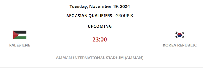한국은 팔레스타인과 11월19일 오후 11시에 싸우게 된다.