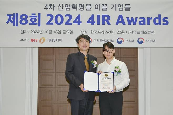 임혁순 파일러니어 이사(사진 오른쪽)가 18일 오후 서울 중구 한국프레스센터에서 열린 머니투데이 주최의 '2024 제8회 4IR 어워즈(4th Industrial Revolution Awards)'에서 '전력 모니터링 및 분석 솔루션'으로 '스마트시티 부문 대상'을 수상하고 진상현 머니투데이 상무와 기념사진을 찍고 있다.