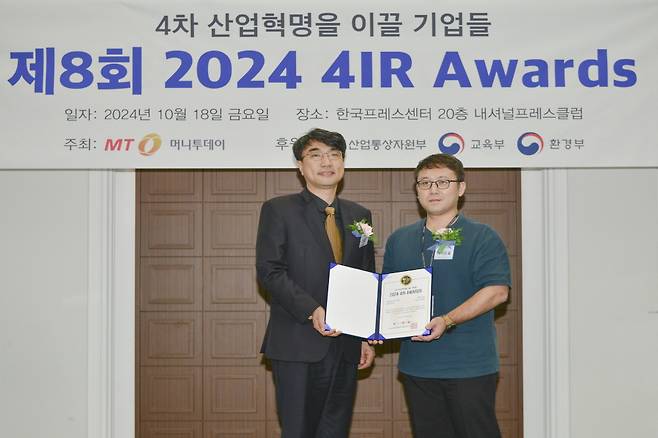 김제필 에이드올 대표(사진 오른쪽)가 18일 오후 서울 중구 한국프레스센터에서 열린 머니투데이 주최의 '2024 제8회 4IR 어워즈(4th Industrial Revolution Awards)'에서 '지능형 로봇'으로 '스타트업 부문 대상'을 받고 진상현 머니투데이 상무와 기념사진을 촬영 중이다.