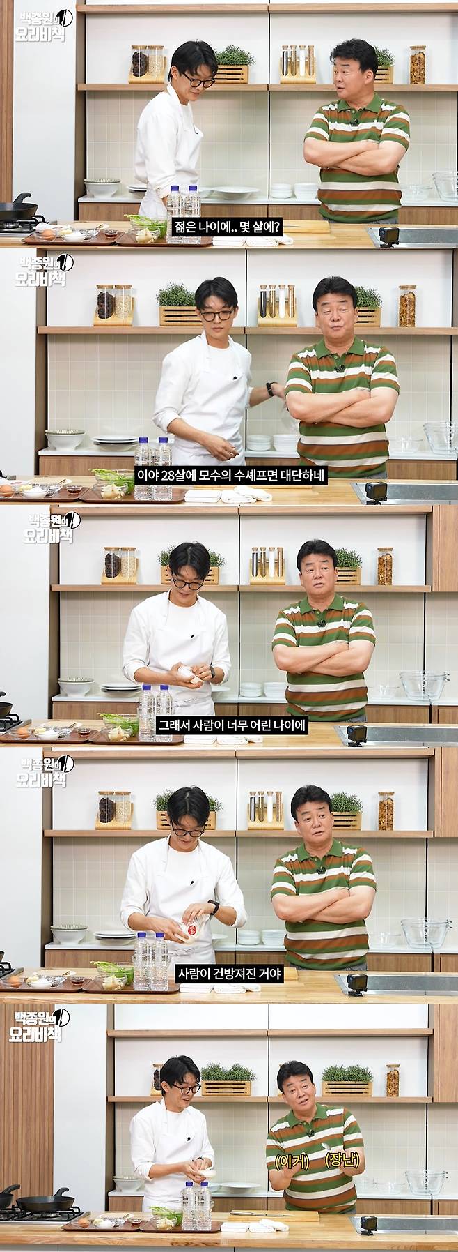 백종원은 강승원을 환영하며 "잘생기긴 진짜 잘생겼다. 사람이 음식만 잘해야 하는데"하고 부러움을 드러냈다.