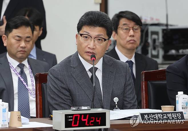 (부산=연합뉴스) 강선배 기자 = 국회 교육위원회의 부산대, 경상국립대, 부산대병원, 부산대치과병원, 경상국립대병원 등 5개 기관에 대한 국정감사가 열린 18일 오후 부산 금정구 부산대에서 정성운 부산대병원장이 이재명 더불어민주당 대표 헬기 이송에 대한 질의에 답변하고 있다. 2024.10.18
