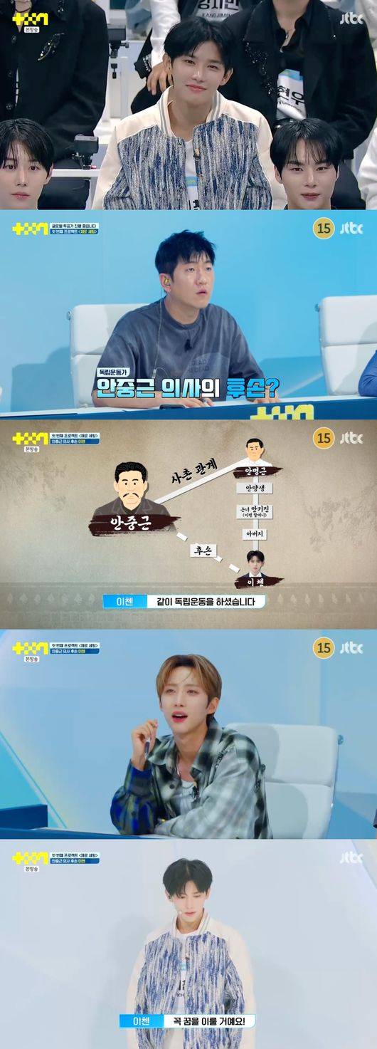 이첸은 "고조할아버지가 안명근 선생이시고, 안중근 의사 사촌동생으로 함께 독립운동을 하셨다. 더 책임감을 갖고 있다"라고 자부했다.