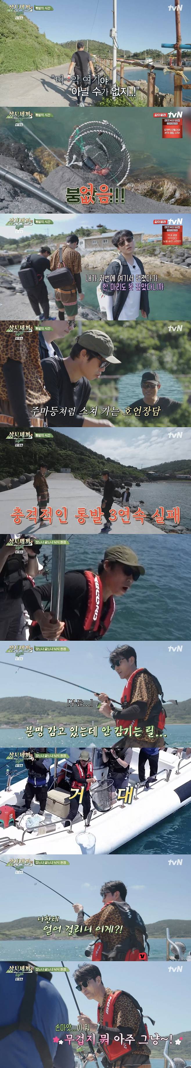이후 바다 낚시에 도전, 계속되는 실패 끝에 장장 2시간 만에 초심자 차승원이 거대 부시리를 잡는데 성공했다. 차승원은 "나한테 얻어 걸리냐. 손 맛이 아주 그냥 무겁다"며 웃었고, 반면 생각이 많아 보이는 유해진의 표정이 웃음을 안겼다.