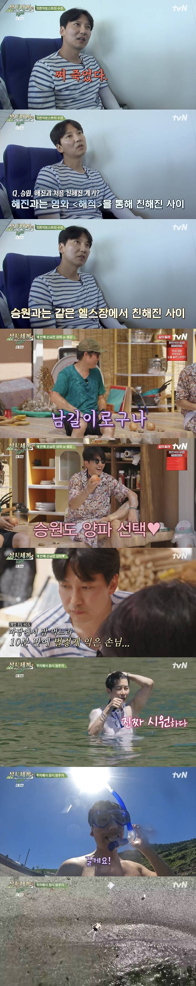 김남길은 "원래 승원이 형 'YES' 안 하냐"고 했고, 유해진은 "재수 없었다"고 해 웃음을 안겼다. 이에 차승원은 "나 안 먹는다"며 티격태격 케미로 웃음을 안겼다.