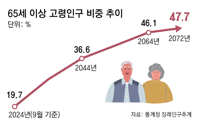 10일 행정안전부 주민등록 인구통계에 따르면 지난달 기준 국내 65세 이상 인구는 1011만695명으로 전체 5124만8233명의 19.7%를 차지했다. 통계청 추산에 따르면 내년 65세 이상 노인 인구 수는 1051만 명(20.3%)으로 초고령사회에 진입한다. 한국이 고령사회가 된 2017년(14.21%) 이후 8년 만이다.