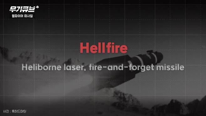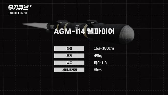 AGM-114 헬파이어는 163~180㎝ 길이에 무게 45㎏ 짜리 미사일입니다. 마하 1.3의 속도로 8㎞ 까지 날아가죠.