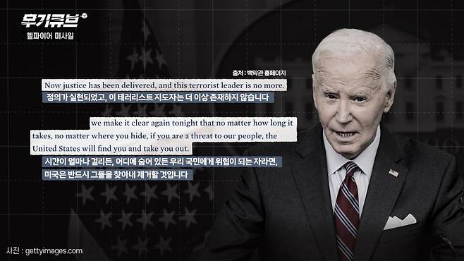 바이든 대통령은 “정의가 실현됐다”며 “시간이 얼마나 걸리든, 어디에 숨어 있든 우리 국민에게 위협이 된다면 미국은 당신을 찾아 제거할 것”이라고 목소리를 높였습니다.