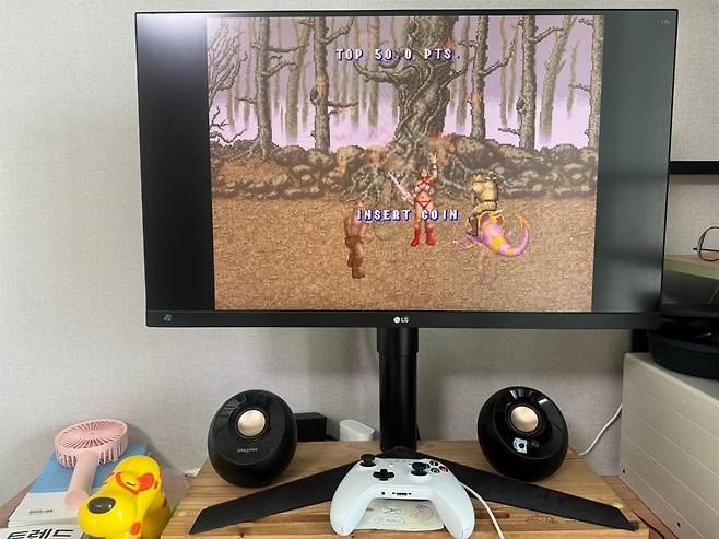 집에 전문 오락기는 없지만 게임용 패드가 하나 있었다. 딸은 게임 패드, 나는 키보드를 붙잡고 '황금 도끼' 2인용 플레이를 했다. 키보드 버튼만 누르면 '가짜 동전(크레디트)'이 달칵 쌓였다. 국민학교 시절에는 백 원짜리 동전 하나 넣을 때마다 '1'씩 올라가는 크레디트 효과음이 그렇게 짜릿할 수 없었다. 그런데 이제는 전기 신호 하나로 무한 목숨을 누릴 수 있었다.