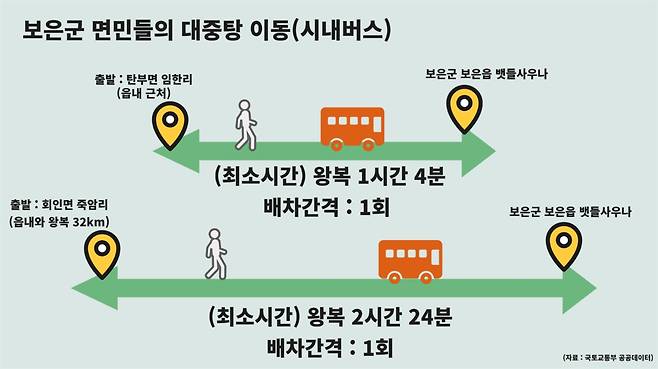 | ▲ 시내버스 기준 보은 면민의 대중탕 이동 보은군 뱃들사우나에서 가장 가까운 곳과 가장 먼 면을 각각 버스로 이동했을 때 걸리는 시간과 배차간격 |