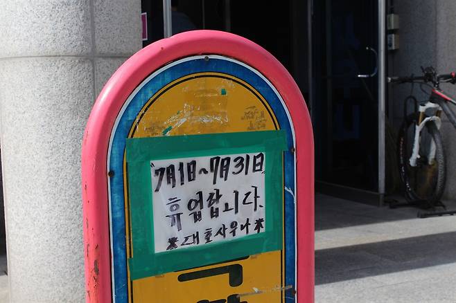 | ▲ 여름 휴무에 들어간 뱃들사우나 여름철 목욕탕 수요 감소로 여름 휴무에 들어간 뱃들사우나 입구에 안내문이 적혀 있다 |