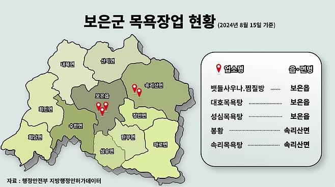 | ▲ 보은 목욕장업 현황 2024년 8월 15일 기준 보은군의 목욕장업 현황. 행정안전부 지방행정인허가데이터 제공 |