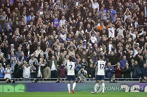 Tottenham Hotspur's Son Heung-Min, left, celebrates scoring with fans during the English Premier League soccer match between Tottenham Hotspur and West Ham United at the Tottenham Hotspur Stadium, London, Saturday Oct. 19, 2024. (Zac Goodwin/PA via AP) UNITED KINGDOM OUT; NO SALES; NO ARCHIVE; PHOTOGRAPH MAY NOT BE STORED OR USED FOR MORE THAN 14 DAYS AFTER THE DAY OF TRANSMISSION; MANDATORY CREDIT