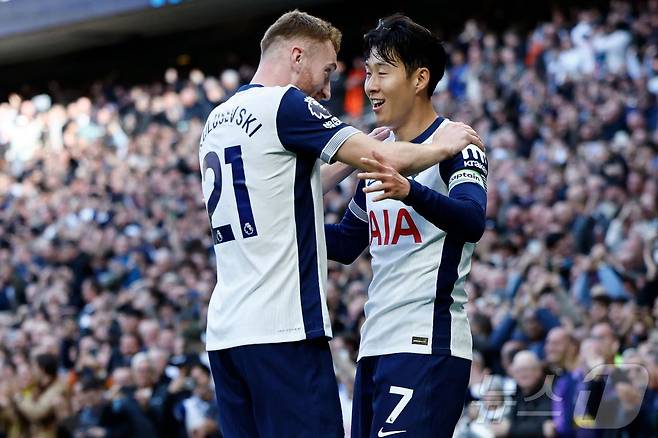 (런던 AFP=뉴스1) 우동명 기자 = 토트넘의 손흥민이 19일(현지시간) 런던 토트넘 홋스퍼 스타디움에서 열린 EPL 웨스트햄 유나이티드와 경기서 시즌 3호 골을 터트린 뒤 도움을 준 데얀 쿨루세브스키와 기뻐하고 있다. 2024.10.20