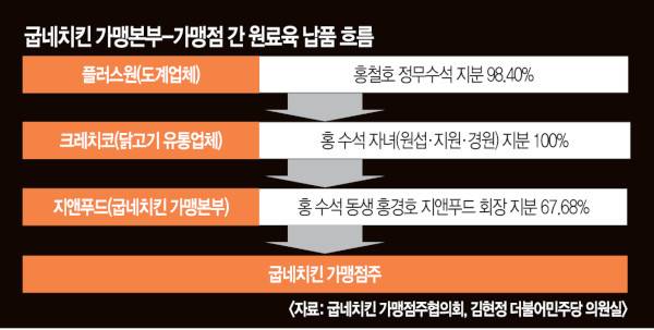 굽네치킨은 홍철호 대통령실 정무수석이 동생 홍경호 현 지앤푸드 회장과 창업한 치킨 프랜차이즈다. 홍 수석이 최대주주(98.4%)인 도계육 기업 플러스원에서 도축한 닭고기가 유통업체 크레치코를 거쳐 지앤푸드에 공급된다. 크레치코는 홍 수석 자녀인 원섭(50%) 지원(25%) 경원(25%)씨 3명이 지분 100%를 갖고 있다.