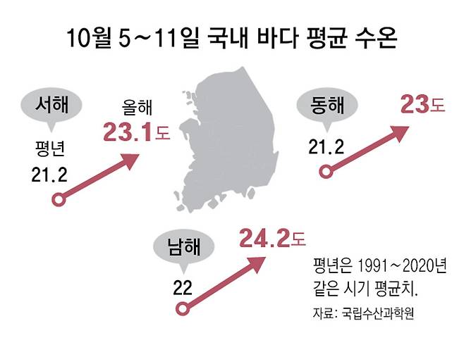 수산물 가격 상승의 가장 큰 원인은 고수온이다. 해양수산부 국립수산과학원에 따르면 이달 5∼11일 남해안 수온은 24.2도로 평년(1991∼2020년)보다 2.2도 높았다. 동해안은 23.0도, 서해안은 23.1도로 각각 평년보다 1.8도, 1.9도 높았다. 올해 고수온 특보 발령 기간은 역대 최장인 71일간 이어져 양식어업 피해도 컸다. 고수온 주의보는 평년 대비 2도 이상 수온이 변동할 때 내린다.