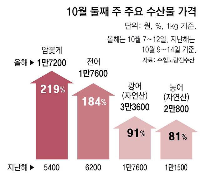 꽃게도 마찬가지다. 암꽃게 1kg 가격은 1만7200원으로 전년 대비 219% 비싸졌다. 수협중앙회 회원조합 통계에 따르면 지난달 꽃게 위판량은 2707t으로 전년 동기(5152t) 대비 47.5% 감소했다. 한 대형마트 관계자는 “사전 계약한 선단(船團)을 통해 물량을 겨우 확보해 판매하는 중”이라고 말했다. 소비자들이 가장 자주 찾는 횟감인 자연산 광어와 자연산 농어도 1kg 기준 가격이 각각 3만3600원, 2만800원으로 전년 대비 91%, 81% 올랐다.