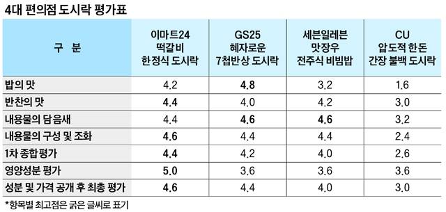 평가단은 밥·반찬의 맛, 내용물의 담음새, 내용물의 조화 및 구성 등 4개 항목에 가장 먼저 점수를 매겼다. 항목별 평가 점수를 두루 반영해 1차 평가 점수를 냈다. 이후 원재료와 영양성분을 평가했다. 이후 가격을 공개한 뒤 가성비까지 반영해 최종평가를 내렸다.