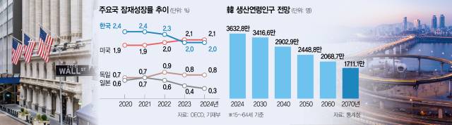 문제는 한국의 잠재성장률 하락 속도가 가파르다는 점이다. OECD는 한국의 잠재성장률이 2020~2021년 2.4%에서 2022년 2.3%를 거쳐 지난해 2.0%까지 떨어졌다고 분석했다. 이는 저출생·고령화에 생산연령인구가 급감하고 경직된 노사 관계 탓에 기업들이 옴짝달싹 못하고 있기 때문이다. 이철인 서울대 경제학과 교수는 “생산성을 높일 구조 개혁이 필요한 시점”이라고 강조했다.