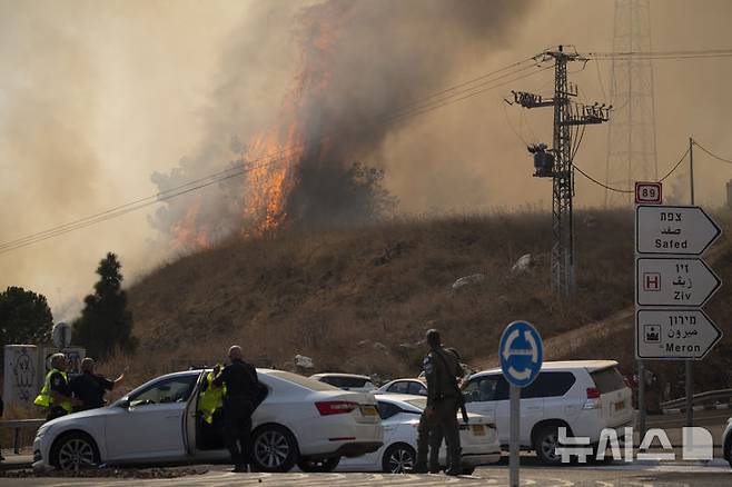[로쉬 피나=AP/뉴시스] 이스라엘 군인들이 20일(현지시각) 레바논에서 발사된 로켓이 이스라엘 북부 로쉬 피나 인근에 떨어져 발생한 화재를 지켜보고 있다. 2024.10.21.