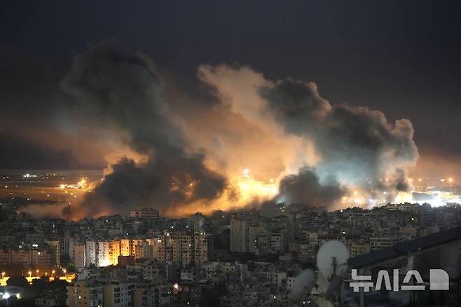[다히예=AP/뉴시스] 20일(현지시각) 레바논 베이루트 남부 교외 다히예에서 이스라엘의 공습으로 불길과 연기가 치솟고 있다. 레바논 보건부는 이스라엘과 헤즈볼라의 전투가 시작된 이후 이스라엘 공습으로 레바논 사망자가 2464명, 부상자는 1만1530명에 이른다고 발표했다. 2024.10.21.