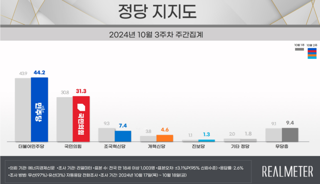 지난 17∼18일 전국 18세 이상 성인 1003명을 대상으로 이뤄진 정당 지지도 조사에서는 국민의힘이 31.3%, 더불어민주당이 44.2%를 각각 기록했다. 일주일 전과 비교해 국민의힘과 민주당은 각각 0.5%포인트, 0.3%포인트 올랐다. 양당 격차는 지난주 조사 13.1%포인트에서 12.9%포인트로 소폭 줄었으나 여전히 오차범위 밖이다.
