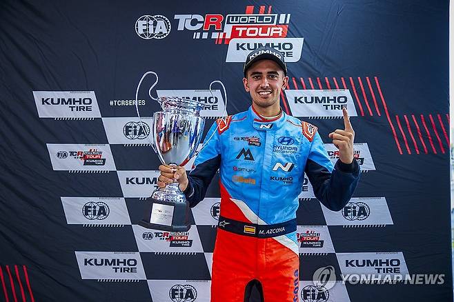 (서울=연합뉴스) 현대자동차는 지난 17일부터 20일(현지시간)까지 4일간 진행된 2024 월드랠리챔피언십(World Rally Championship·WRC) 12번째 라운드 '중부 유럽 랠리'에서 현대자동차 월드랠리팀 오트 타낙(Ott Tanak) 선수가 1위를 차지했다고 21일 밝혔다. 사진은 미켈 아즈코나 선수가 '2024 TCR 월드 투어' 주저우 대회에서 첫 번째 결승 레이스 우승을 차지하고 포디움에서 기뻐하는 모습. 2024.10.21 [현대자동차 제공. 재판매 및 DB 금지]