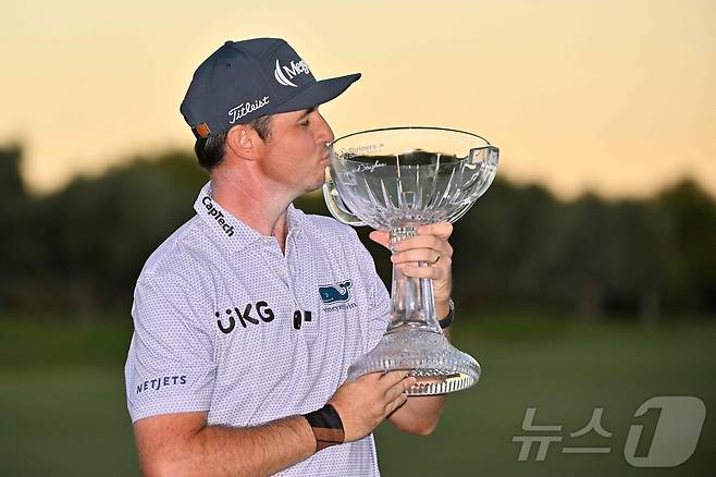 (라스베이거스 AFP=뉴스1) 우동명 기자 = 미국의 J.T 포스턴이 20일(현지시간) 네바다주 라스베이거스의 TPC 서머린에서 열린 PGA 투어 슈라이너스 칠드런스 오픈서 투어 3번째 우승 트로파에 입을 맞추고 있다. 2024.10.21