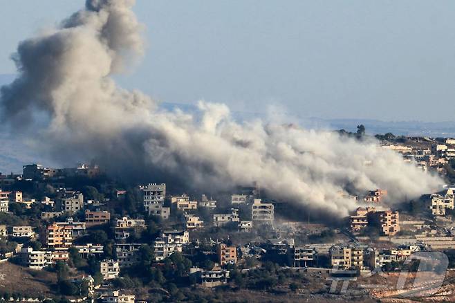 (키암 AFP=뉴스1) 우동명 기자 = 20일(현지시간) 레바논 남부 키암에서 이스라엘 군의 공습을 받아 연기가 솟아 오르고 있다. 2024.10.21