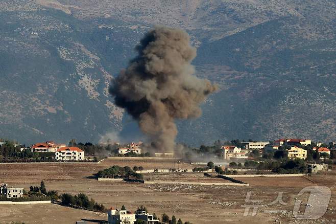 (키암 AFP=뉴스1) 우동명 기자 = 20일(현지시간) 레바논 남부 키암에서 이스라엘 군의 공습을 받아 연기 기둥이 솟아 오르고 있다. 2024.10.21
