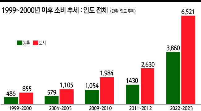 인도의 사회경제지표는 지난 10년간 크게 개선됐다. 2022~2023년도 가계 소비 지출 조사(Household Consumption Expenditure Survey) 1차 데이터에 따르면, 1인당 지출이 증가하고 식품 소비 패턴이 변하면서 인도 전역의 생활 수준이 대폭 향상됐다. 농촌 가구의 1인당 소비는 164%, 도시 가구는 146% 증가했다. 서벵골과 타밀나두 같은 주가 비약적으로 성장했고, 시킴의 농촌 지역은 394%가 증가해 선두를 차지했다. 또 독립 이후 처음으로 가계의 식품 지출이 전체 지출의 50% 아래로 떨어졌다. 소득 수준이 높아질수록 지출에서 음식이 차지하는 비중이 줄어든다는 엥겔 법칙에 인도의 경제 발전이 부합하고 있다는 뜻이다. 또 하나 중요한 추세는 하위 20% 가구의 곡물 소비가 감소한 것이다. 이는 국민식량안정제도(PMGKAY) 등 정부 사업이 성공을 거둔 때문일 가능성이 크다.