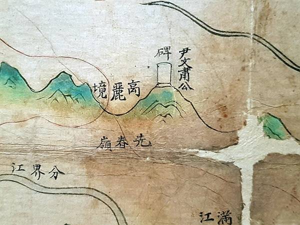 | ▲ 사진속 고지도를 보면 '두만강' 을 뛰어넘어 '선춘령''과 '고려경'이 보이고 윤관이 세웠다는 비석이 보인다. |